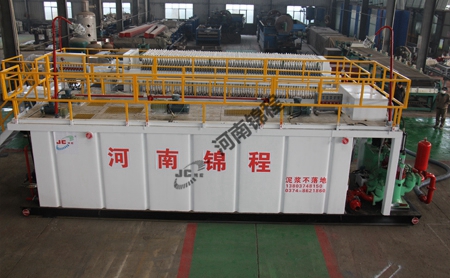 此工藝主要流程為:將鉆井過程中排放的廢棄泥漿通過泥漿收集箱,用泵提升送至巖屑緩存裝置,用泵提升至破乳混凝罐,用干粉投加機(jī)定量加破乳、助凝藥?;炷河商沾呻p缸泵抽至撬裝隔膜壓濾機(jī)進(jìn)行固液分離,分離出來的泥餅由皮帶輸送機(jī)輸送出壓濾單元,濾液進(jìn)入后續(xù)凈化處理裝置。