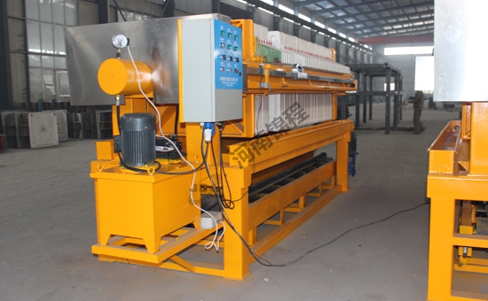 4工作時,由壓緊裝置(油缸活塞桿或絲桿)推動壓緊板,將位于壓緊板和止推板之間的濾板和濾布壓緊,被壓緊的濾板與濾板之間形成了濾室,由料泵壓入的物料從止推板進(jìn)料孔進(jìn)入各個濾室,固體顆粒被截留在濾室內(nèi),并形成濾餅,液體則透過濾餅和濾布由出液孔排出機體外。若需要對濾餅進(jìn)行清洗,可用尾板上的洗液口通入洗滌水對濾餅進(jìn)行清洗。若需將濾餅吹干,可由洗液口通入壓縮空氣,將濾餅吹干。